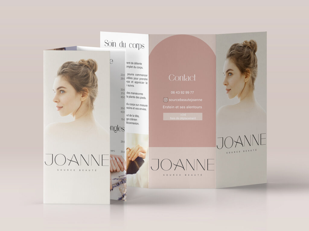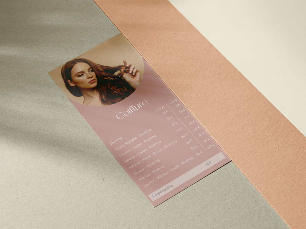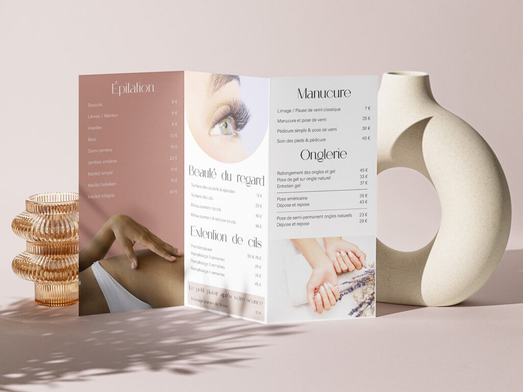 La mise en page met en valeur les différents soins et prestations, tout en intégrant clairement la grille des tarifs, afin de faciliter la lecture et le choix des clientes. Cette création graphique allie esthétisme et fonctionnalité, offrant au salon un support professionnel qui reflète parfaitement son image et attire une clientèle en quête de qualité et de détente.